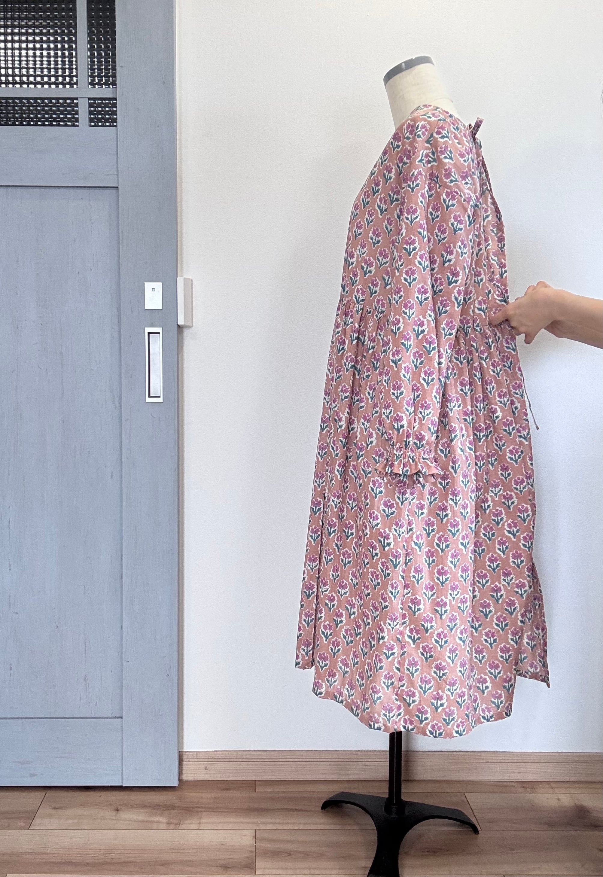 【即納】割烹着ワンピース ブロックプリント ピンク 花柄