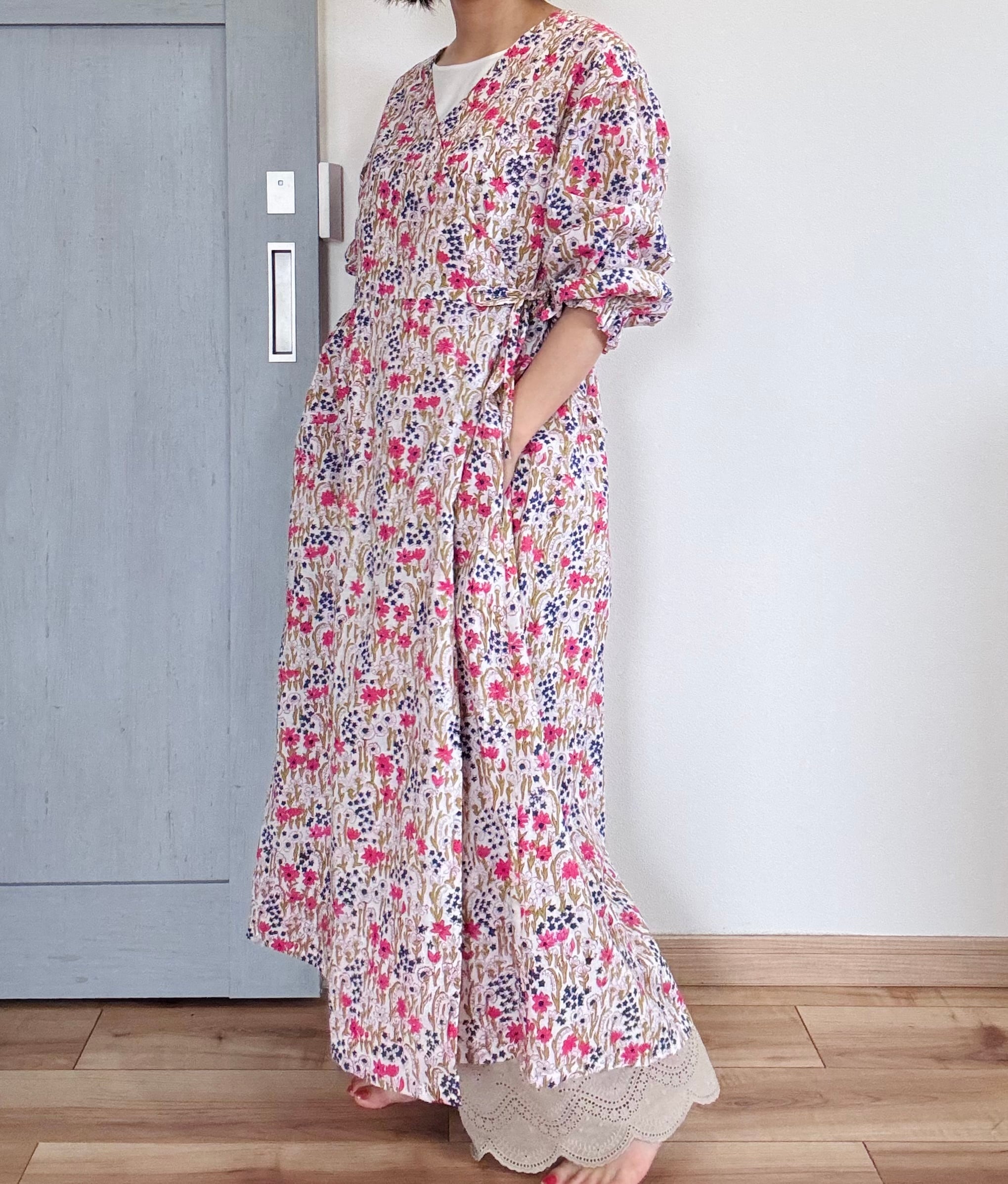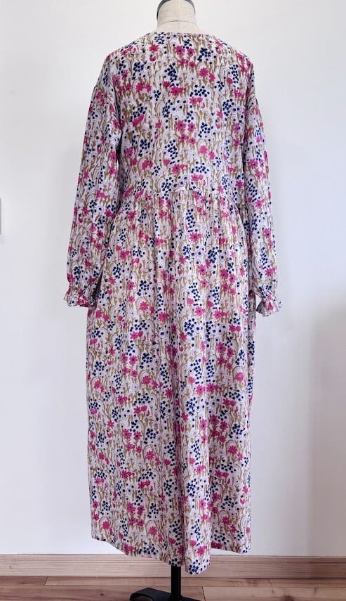【即納】ブロックプリント インド綿 カシュクール割烹着ワンピース 小花柄